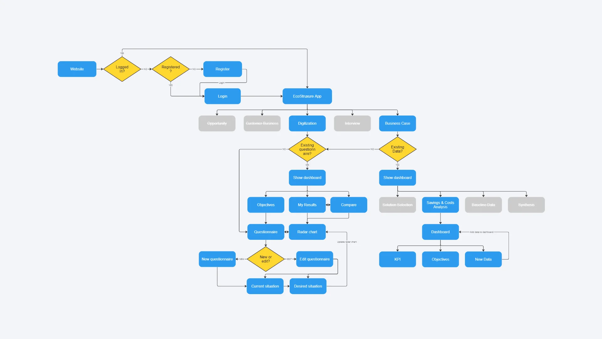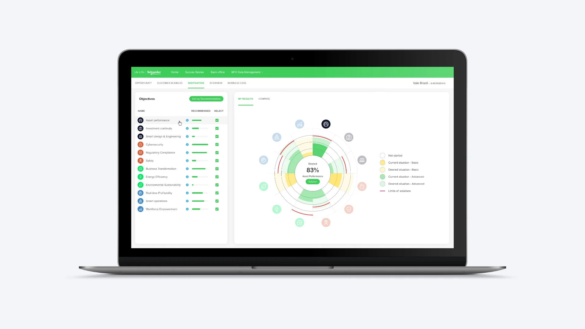 Mon objectif était de faire une refonte complète de l’outil existant, basé essentiellement sur une utilisation intensive de tableaux Excel. L’outil devait permettre aux clients d’avoir une vue d’ensemble de la digitalisation de leur entreprise, et aux équipes de Schneider Electric de pouvoir leur proposer des solutions pertinentes et sur mesure.